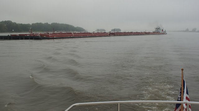 Kaskaskia Lock is on the Kaskaskia River, and we do not enter it. It is just a stop along the way where cruisers can tie up to a wall overnight, in this case at no charge, but there are no services. It is in this trip we do our first Miss. Mambo. It is both exhilarating and frightening. As we enter a curve in the river, we have to keep to the outside where the current is faster. The turbulence is caused by wing dams extending under water from the inside of the curve to direct the water to the outside. This helps to prevent shoaling in these areas. The good news is we get thru it pretty quickly as the current give us a boost to almost 15 smph. One of the rules at this lock is you cannot tie up to or climb the rail fence. When you see them it is apparent as to why. They are mostly broken off their bases. It is also apparent they were built by the lowest bidder. Since the fences are on the edge of the wall, you have to duck between the rails to get off or on the boat. But we don’t complain, because “happiness is being tied up!” After “Happy Hour” with Gemini and The Cooper, we have a hot dog and bean dinner with Theresa and Don from Great Escape.