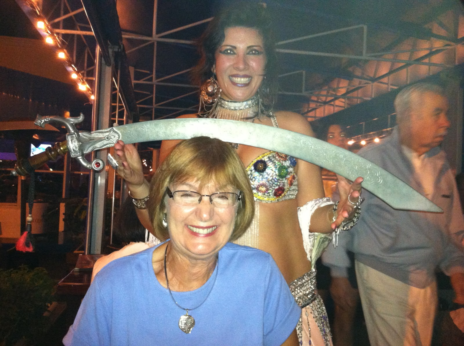 We left Dinner Key thru the mooring channel and into the north section of Biscayne Bay. As we get closer to Miami, the bay narrows to a wide channel with the city of Miami to the west, and the port of Miami, the home of many cruise ships to the east. It’s not the natural beauty we have been seeing, but is very impressive, especially the Miami skyline. North of Miami the trip to Hollywood was mostly through highly populated areas with expensive homes and condos lining both banks of the river. When we arrived at the Hollywood Municipal Marina we pulled up to the fuel dock to empty the holding tank and get our slip assignment. The slips here have no finger piers so we have to depart the boat from the bow, which turned out to be next to impossible, or from the stern into the dinghy to get ashore, but there was no place to leave the dinghy. Fortunately the Harbormaster decided to put us on the end of “D” dock since the slip owner was away for a few days. We were totally alone on the dock and were able to get on and off the boat easily. That evening we took the bikes over the Hollywood Blvd. Bridge and went to dinner at Oopah, a Greek restaurant on the eastern shore of the ICW. The food was excellent. Instead of butter or oil with our bread, they served a highly seasoned chick peas In a motar and pestle. The idea was to smash the chick peas into hummus, and spread it on your bread. It was so good we could have made a meal of it. The best hummus I’ve ever had. The rest of the meal was also very good and we will make it a point to come back here next trip. The entertainment was a belly dancer, and we will let the pictures speak for themselves.